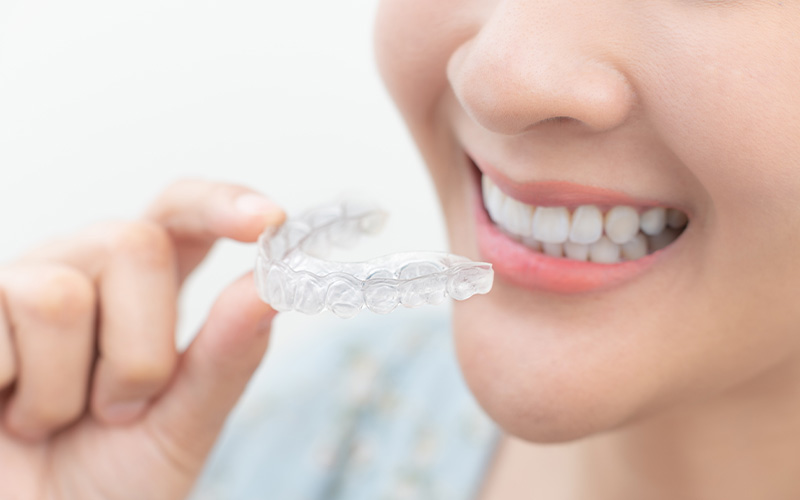 矯正していることを周囲に気づかれにくい、いつでも取り外しができる、痛みが少ないなど、多くのメリットがある全顎的なマウスピース矯正です。